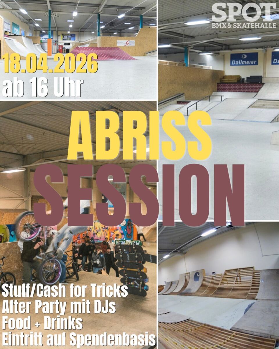 Ihr wollt noch einmal die Halle im alten Layout fahren? Ihr habt Boch auf exklusive Challanges an den „OG“-Obstacles und wollt Stuff & Cash abgreifen? Und im Anschluss wollt ihr bei der After-Show-Party auf den anstehenden Umbau anstoßen? Dann kommt nächsten Samstag in die Halle zur ABRISS-SESSION!